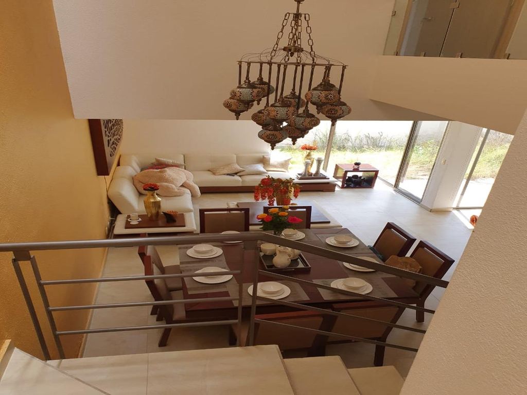 PLANTA BAJA -> Sala, comedor a doble altura, cocina integral con barra y cubierta de granito, medio baño para visitas, patio de servicio, jardín amplio y 2 estacionamientos.