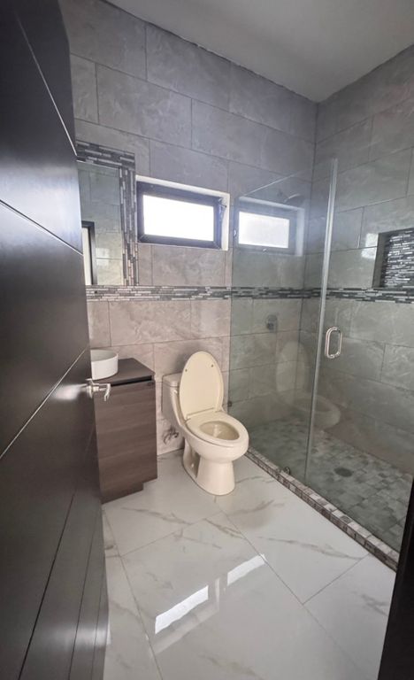 * Baño completo con regadera de cristal y acabados en azulejo.