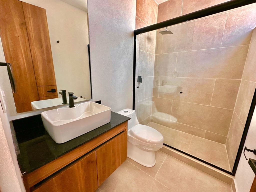 La planta baja te recibe con una calidez excepcional. Disfruta de una cocina totalmente equipada que se integra a una estancia de sala y comedor amplia y luminosa. Pensando en la versatilidad, este nivel cuenta con una habitación completa con clóset y baño propio, ideal para recibir visitas con total comodidad o para quienes prefieren la practicidad de vivir en un primer nivel. Además, cuenta con bodega, área de lavado y un jardín privado que invita al descanso.