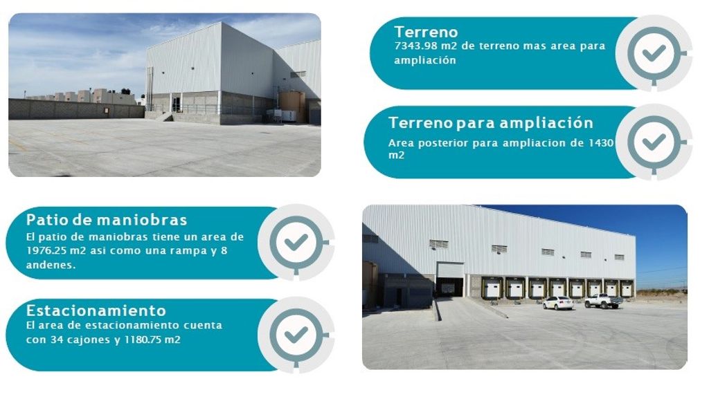 Terreno: 7343.98 m2 más área para ampliación. Área posterior para ampliación de 1430m2
