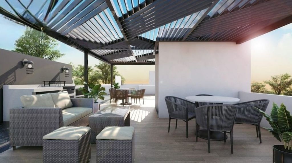 Cuenta con 2 habitaciones, sala, comedor, cocina,1 cuarto de lavado, 2 baños completos, Rooftop, 1 caja de estacionamiento.