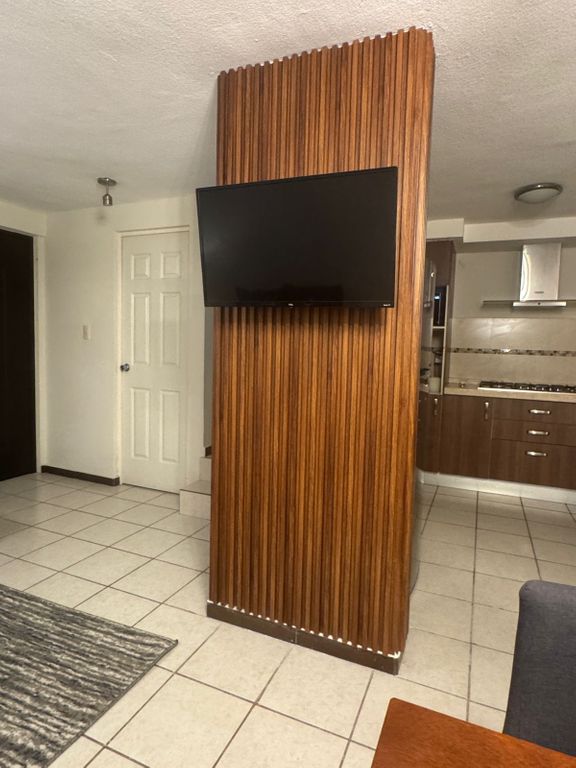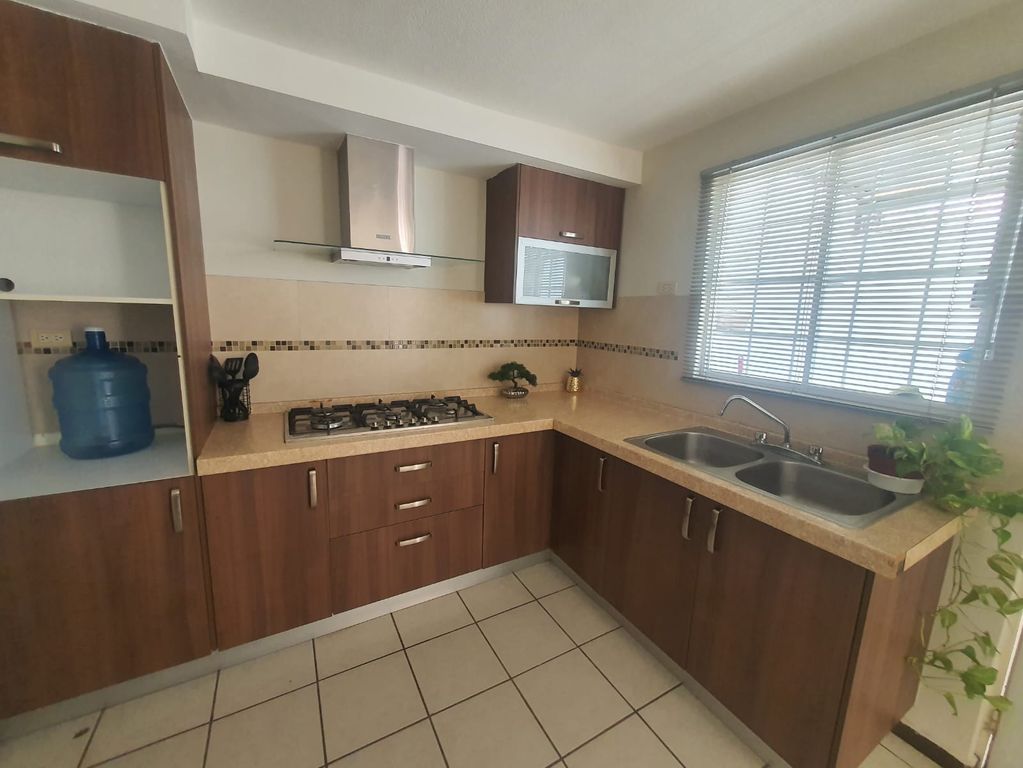 Descubre un espacio acogedor con acabados visibles en las imágenes, como la cocina integral equipada con parrilla y campana, y un área de sala-comedor lista para disfrutar.