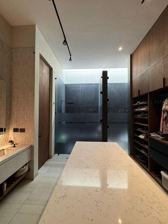 Hermosa casa en venta con acabados de lujo, chapa de nogal en toda la casa, pisos de lujo, canceleria de pvc alemán, cortinas de lino, aires acondicionados, cocina y baños en acabados de cuarzo y nogal, decoración de lamparas y muebles de nogal empotrados, calentador solar y boiler, muros en piedra caliche exterior e interior, riego por aspersión sistema de monitoreo de cámaras.