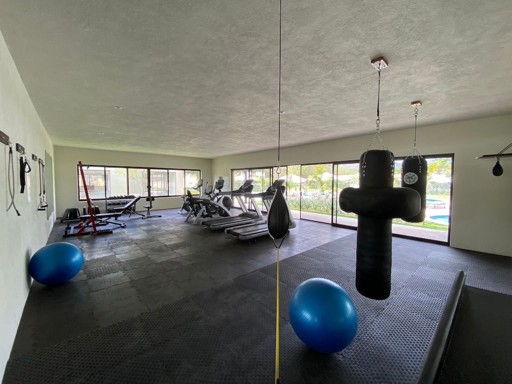 Gimnasio bien equipado con vista panorámica a la piscina y áreas verdes.