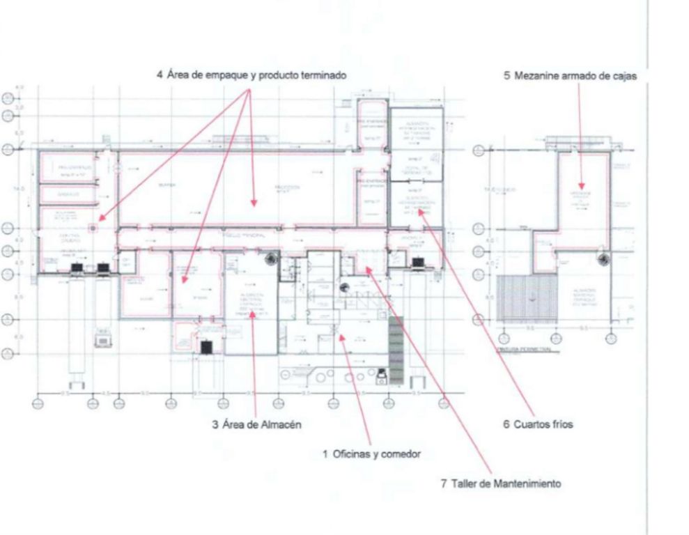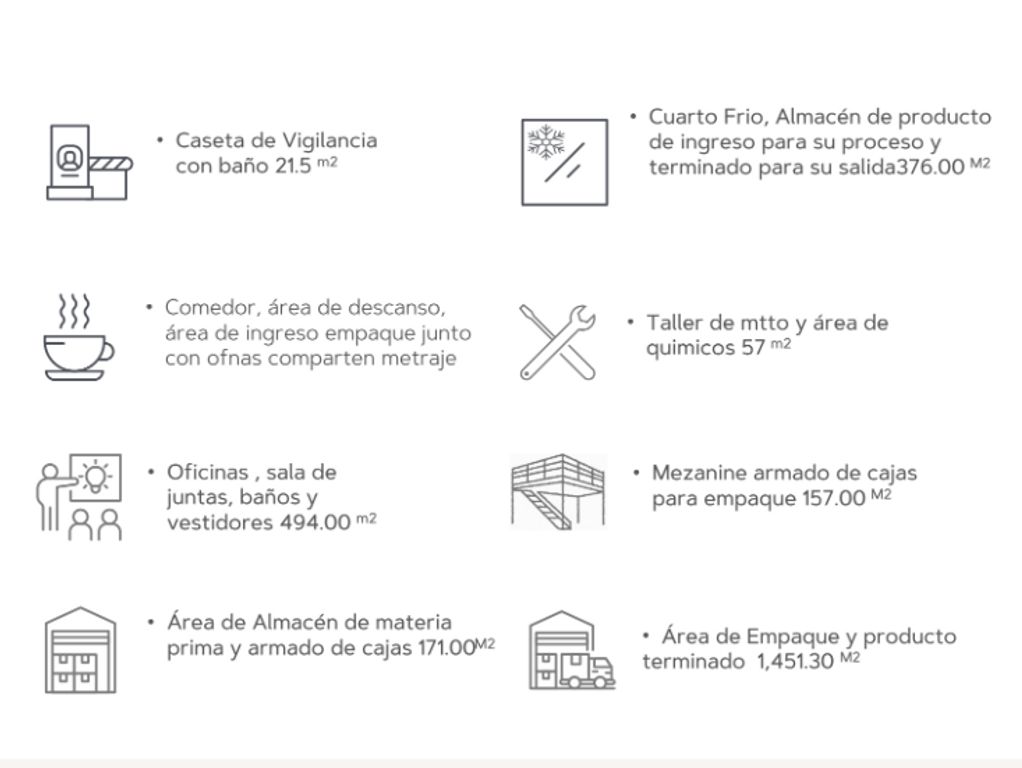 Cuarto frío + almacén de materia prima: 376 m² (más área de almacén de materia prima de 171 m²)