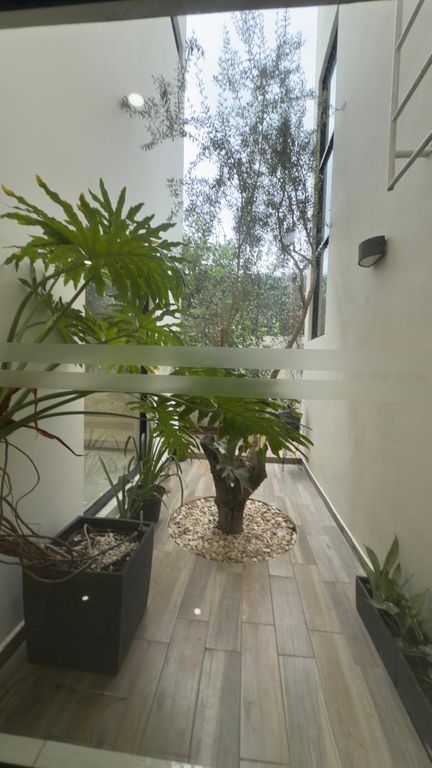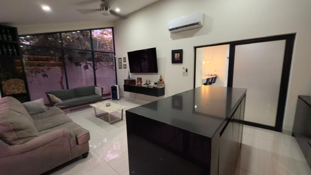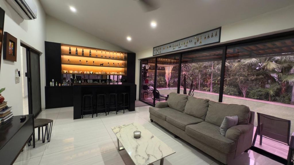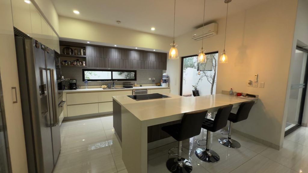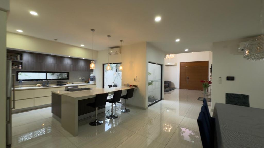 La casa destaca por sus espacios amplios y elegantes, con una sala a doble altura que brinda gran iluminación natural y una sensación de amplitud excepcional. Cuenta con recámara en planta baja, ideal para visitas o personas que prefieran evitar escaleras, además de un bar perfecto para reuniones sociales.