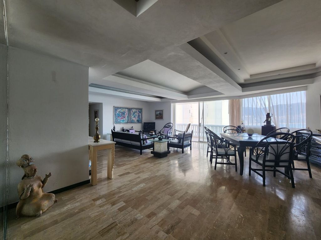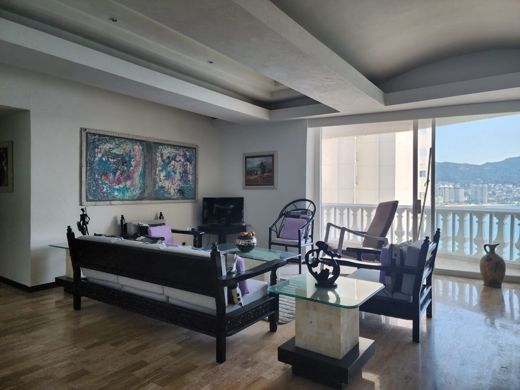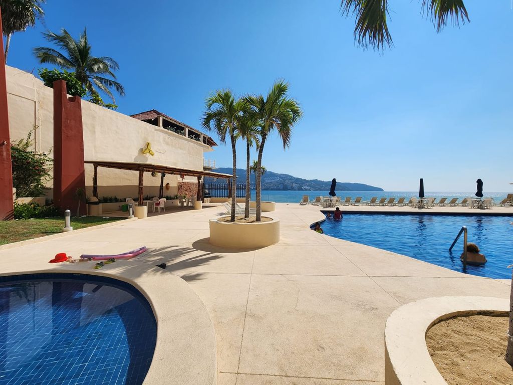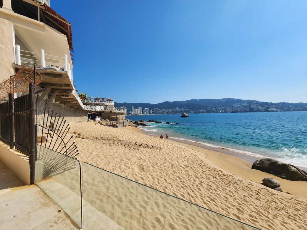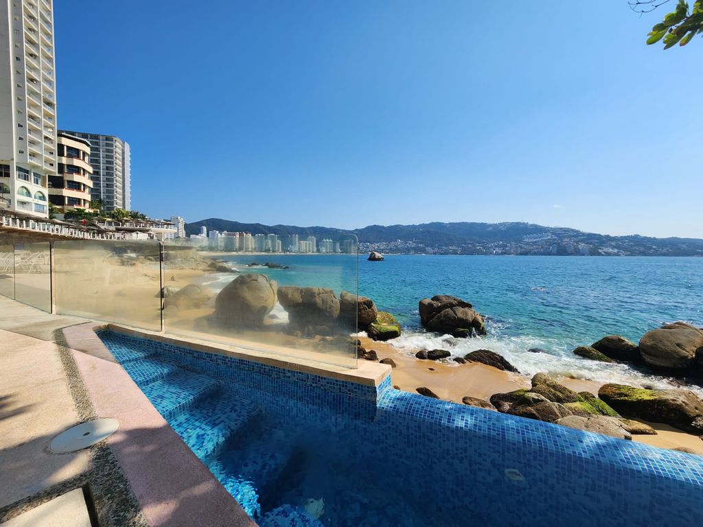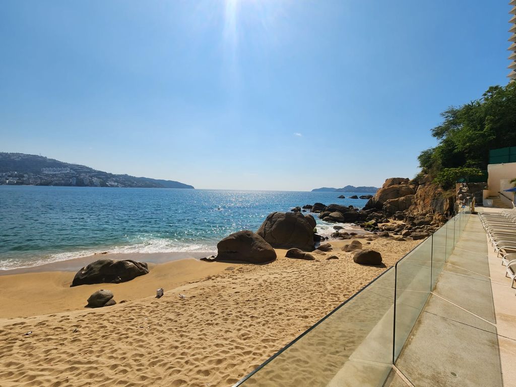 Amplio Departamento sobre Av.Costera y sobre playa, en una zona turística de la Bahia, con muy bonitas vistas y playas, con una ubicación por demás conveniente y con las necesidades basicas a la mano.El edificio de 20 pisos, con 3 departamentos por piso, 2 de los mismos son laterales y el central, frontal con hermosas terrazas y vistas a la bahia de Acapulco; con una ventilación natural fantástica y el área de alberca justo sobre la playa y las rocas, con un área de jacuzzi, amplia terraza-asoleadero, áreas de sol y sombra,todo ésto en un ambiente de tranquilidad, privacidad, seguridad, y lo mejor, con una vista frontal y espectacular a la hermosa bahia de Santa Lucía, a las rocas, las olas, la espuma, y donde presenciarás unos amaneceres y atardeceres espléndidos!