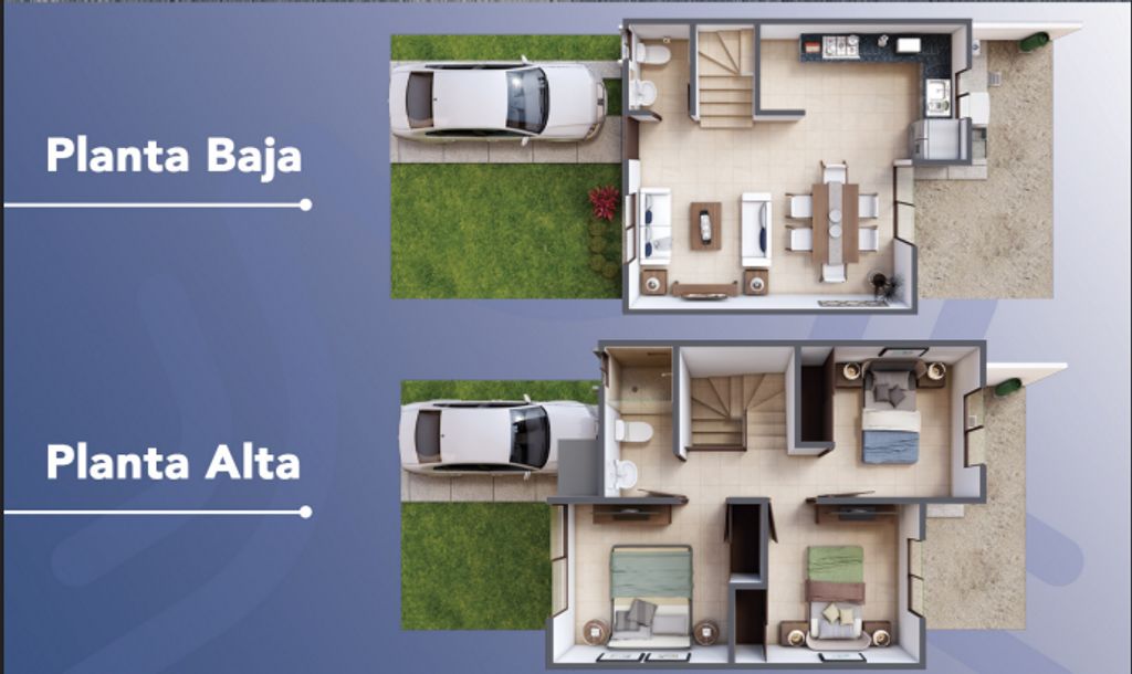 * Distribución inteligente en dos plantas: planta baja con área social y cocina, planta alta con recámaras.