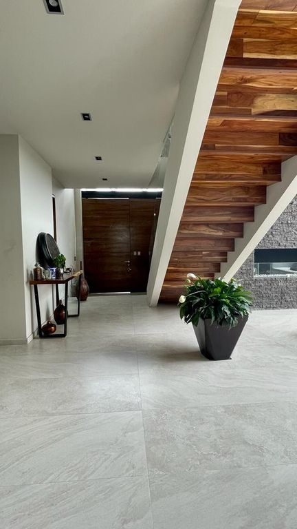 Escalera forrada en madera con barandal de vidrio templado