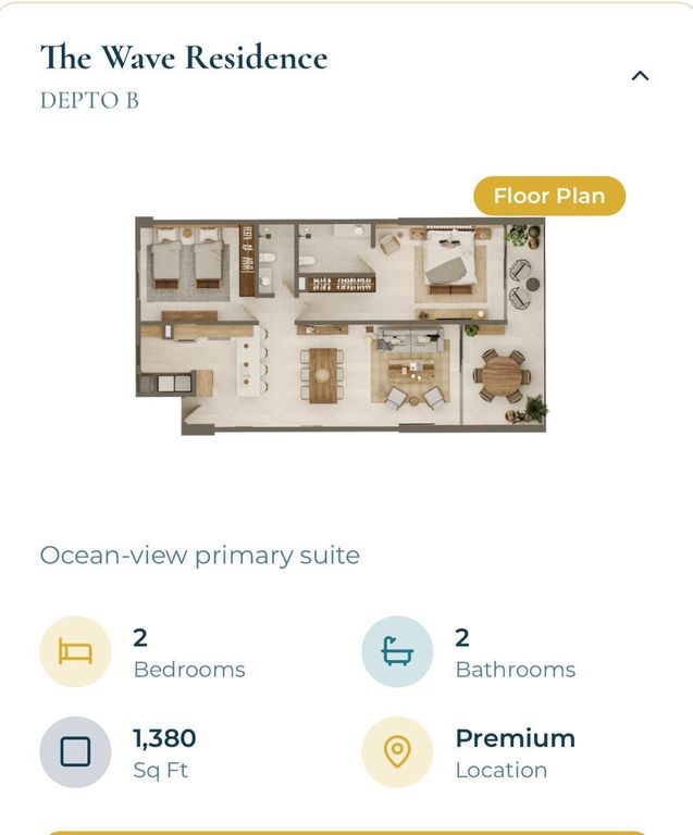 Estrena departamento en ubicación privilegiada, a 10 minutos de la playa en Cabo San Lucas con una vista hermosa al famoso arco. El departamento consta de 2 recámaras, la principal con baño y vestidor, recámara secundaria con closet, sala, comedor, cocina integral con refrigerador, triturador de comida, lavavajillas y horno, área de lavado con centro de lavado, 1 baño completo, terraza, cuenta con aire acondicionado y 2 cajones de estacionamiento. Amenidades como alberca, gimnasio, área de descanso, pabellón gastronómico, centro de spa. Cerca de carretera Transpeninsular, a 15 minutos del centro de Cabo san lucas.Ubicación