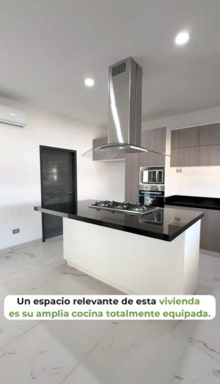 Cochera para 2 autos, recibidor con doble altura conectado con el área de sala, comedor, terraza, cocina integral equipada con accesorios de cocina (microondas, horno, tarja de dos tinas, llave mezcladora, isla con parrilla eléctrica de seis quemadores y campana central, cubierta de granito tipo san gabriel) alacena. cuarto de lavado, medio baño.