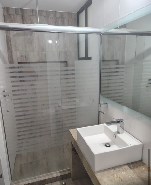 * Baños modernos con canceles de cristal y lavabos de sobreponer.