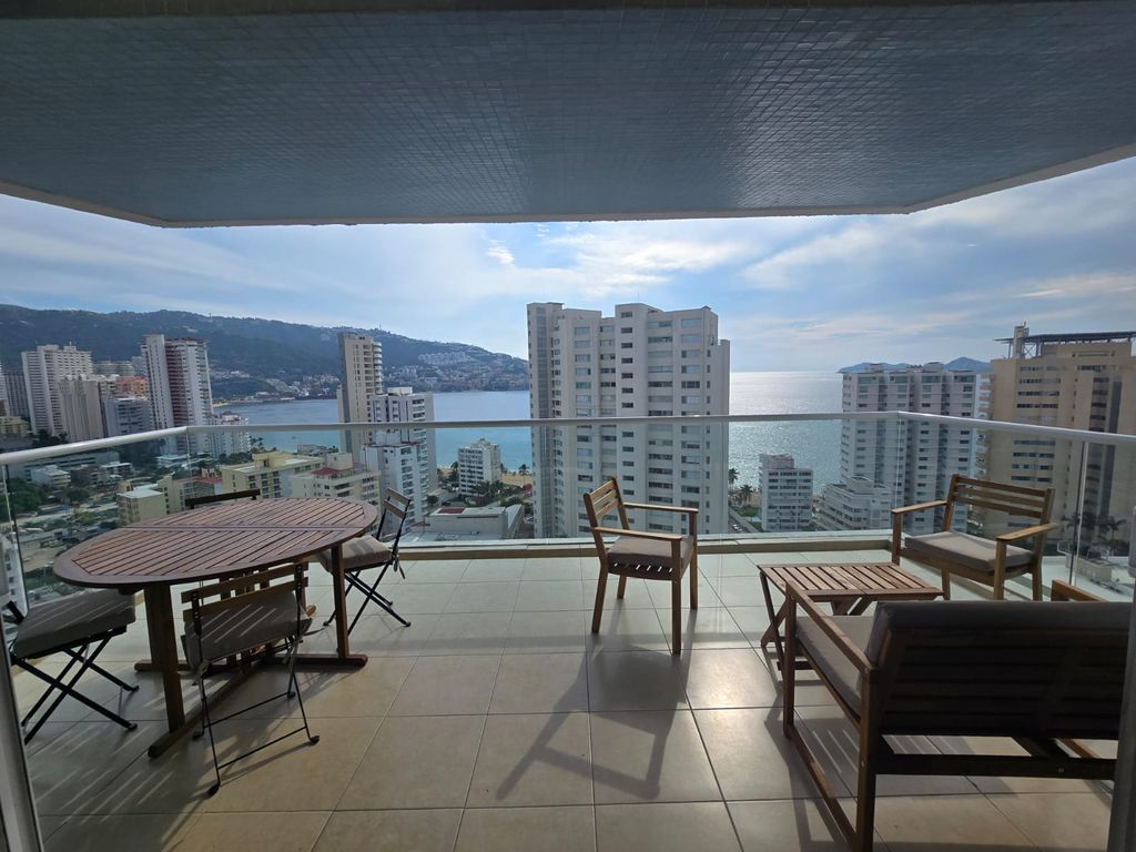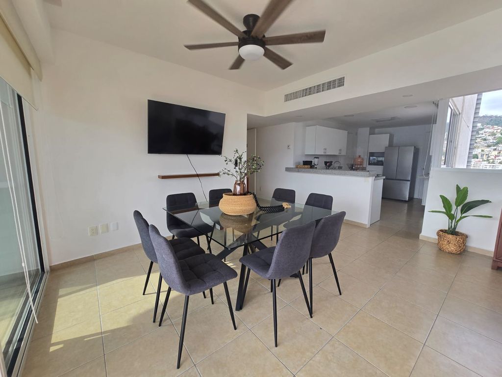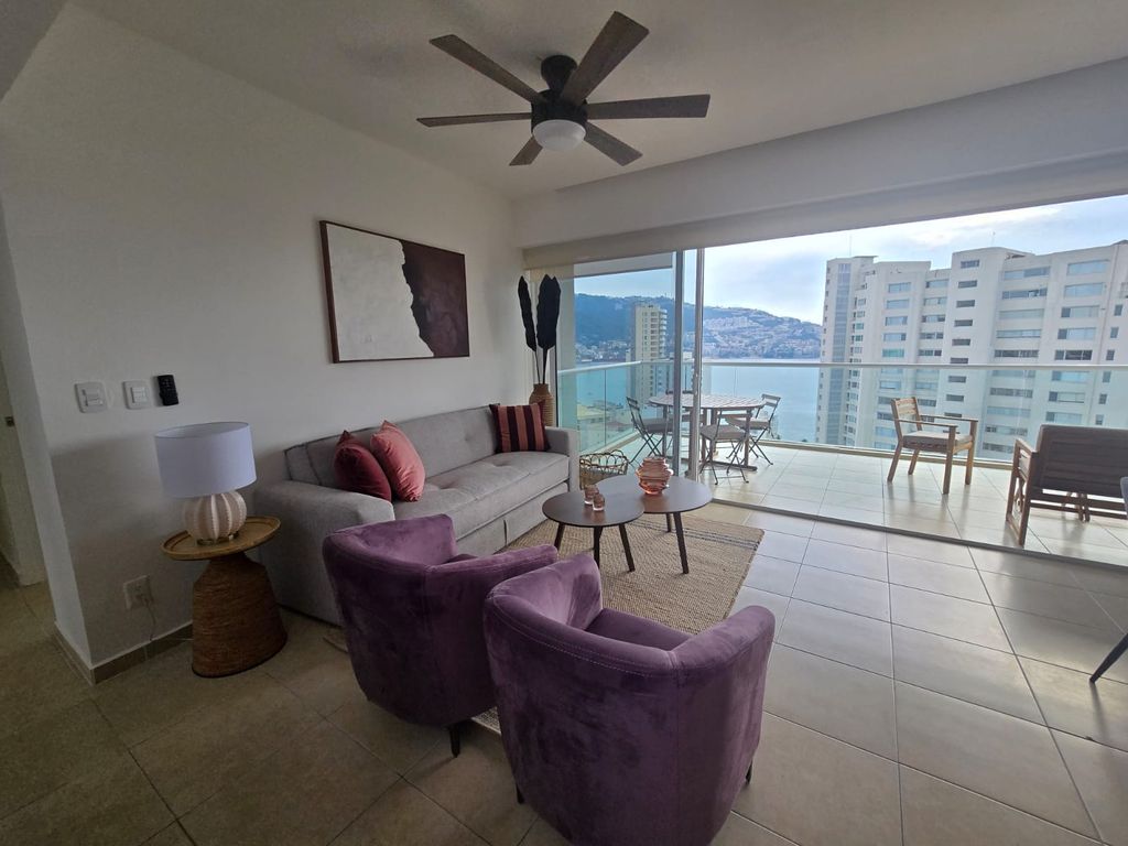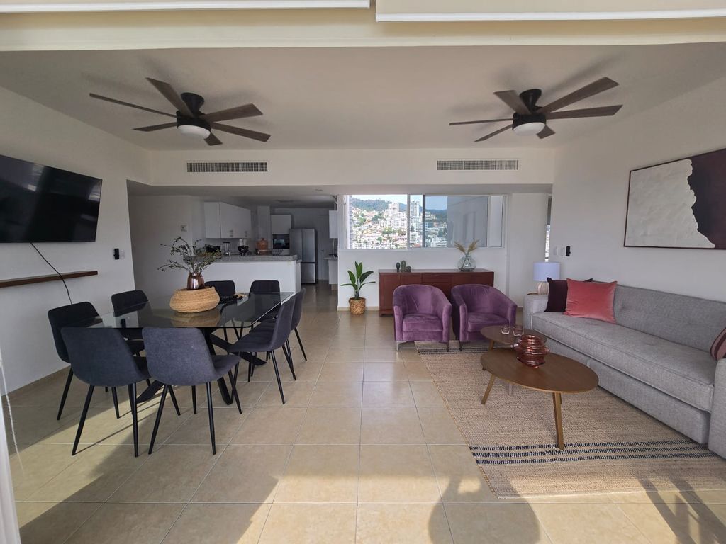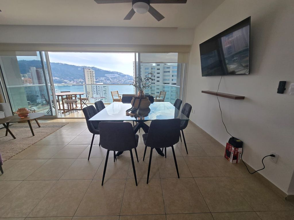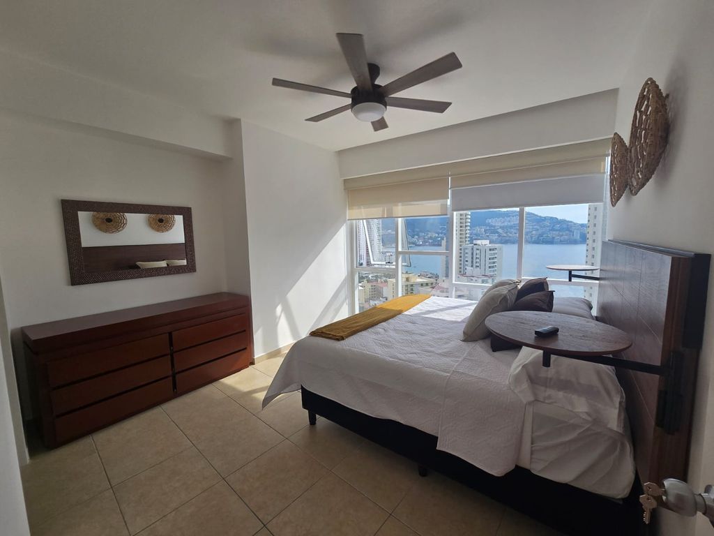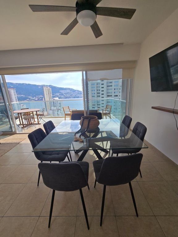 Este moderno y hermoso departamento te espera para pasar momentos padrísimos con vistas panorámicas a la bahía.Este departamento de 140 m² cuenta con 3 recámaras y 2 baños, ideal para tu comodidad, puede hospedar hasta 6 personas. Está totalmente equipado y amueblado, listo para que lo disfrutes sin preocupaciones, cuenta con aire acondicionado en todo el depto., no que lo necesite, ya que con sus amplios ventanales que conectan con la terraza lo hace fresco e iluminado.