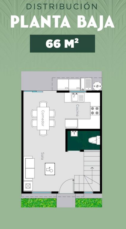 Su distribución incluye sala, comedor, cocina en planta baja, y 2 recámaras con baño en planta alta, todo optimizado para aprovechar al máximo el espacio.