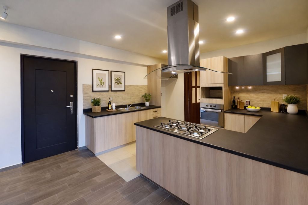 El departamento cuenta con una amplia sala-comedor con excelente iluminación natural, cocina abierta de diseño moderno y cuarto de lavado independiente. Dispone de 3 recámaras de gran tamaño, la principal con vestidor y baño completo, y dos recámaras secundarias con clóset que comparten baño completo en pasillo, ideal también para visitas.