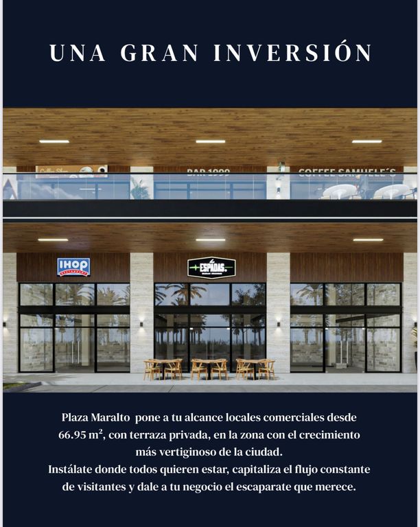 Plaza Maralto pone a tu alcance locales comerciales desde 66.95 m2, con terraza privada, en la zona con el crecimiento mas vertiginoso de la ciudad.Instálate donde todos quieren estar, capitaliza el flujo constante de visitantes y dale a t negocio el escaparate que mereces.