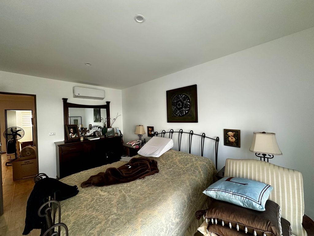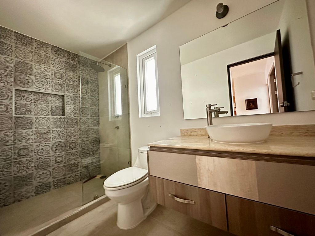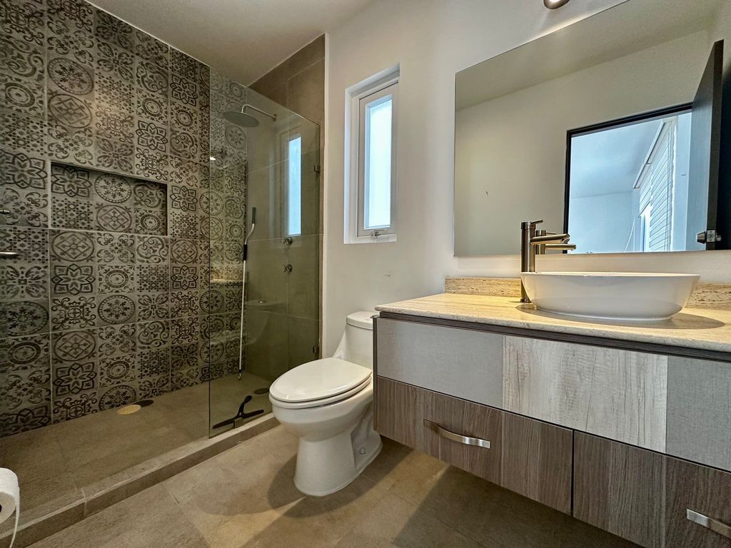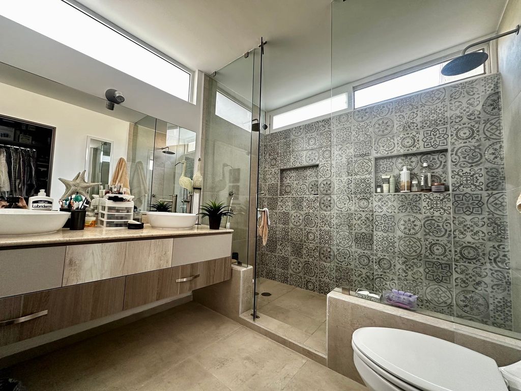 Recámara principal con minisplit, vestidor y baño completo con doble lavamanos, regadera y cancel de vidrio templado
