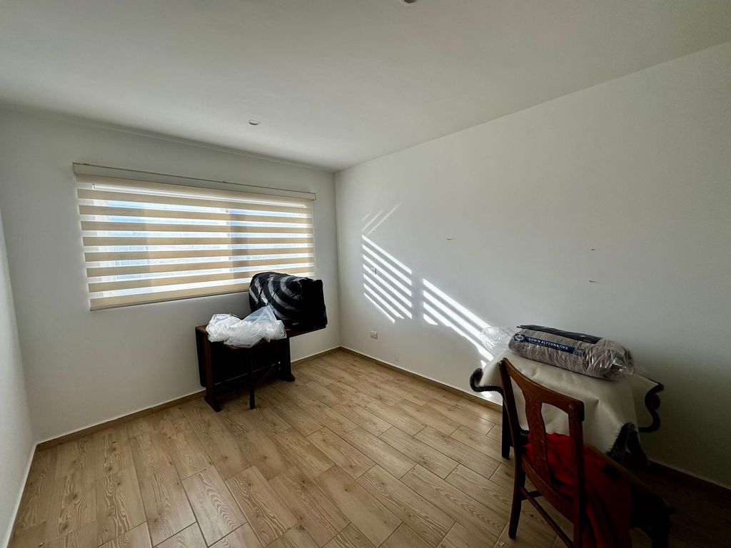 Cochera al frente para dos autos (hasta tres autos pequeños), medio baño para visitas, sala y comedor, cocina integral equipada con alacena, cuarto de lavado cerrado, bodega, terraza y jardín posterior con acceso independiente.