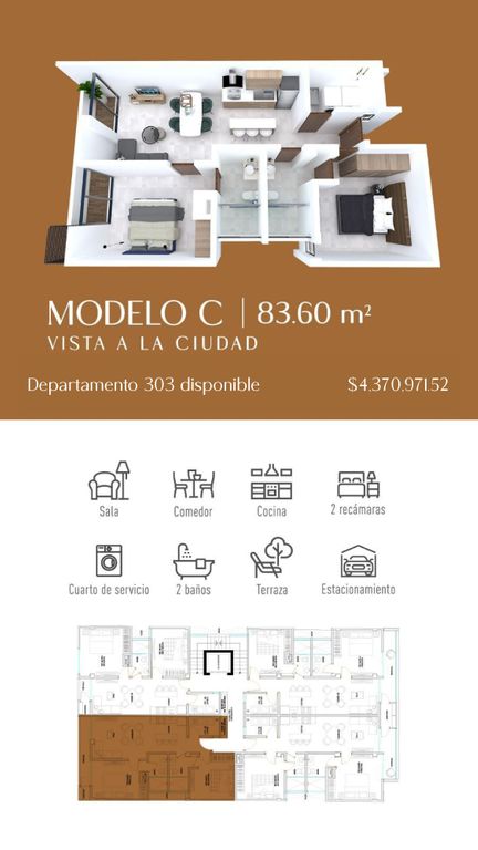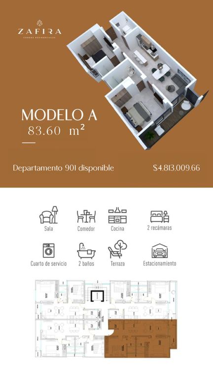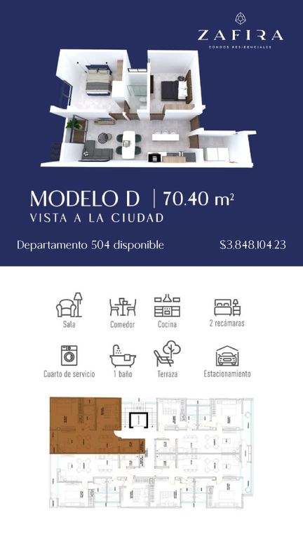 Tu nuevo hogar te espera en Zafira Condos Residenciales. Este departamento de 70.4 m² con 2 recámaras y 1 baño es una excelente opción.