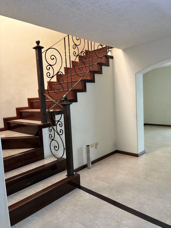 * Escaleras con diseño de madera y barandal de herrería.
