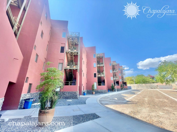 Departamento nuevo de 2 recámaras y 2 baños, 57 m², frente al lago de Chapala en San Cristóbal Zapotitlán. Condominio con alberca, jardín y asoleaderos, a precio súper accesible.