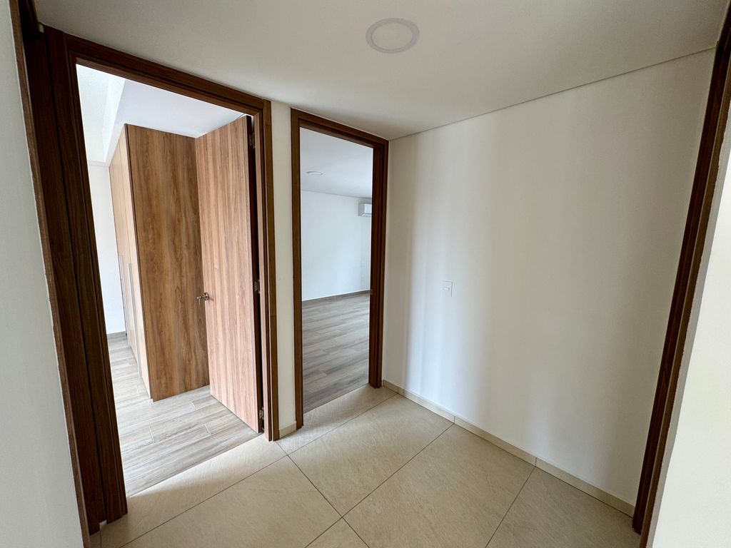 Entrando tienes la cocina integral con barra desayunadora cubierta de granito, estufa de seis quemadores con horno y campana, clóset de lavado con lavadero y espacio para centro de lavado, área para colocar sala o comedor con aire acondicionado y balcón, al fondo se encuentra el distribuidor con dos recámaras secundarias, cada una con aire acondicionado, balcón, clóset, y comparten baño completo que también le da servicio al área social, y por último, la recámara principal tiene vestidor, baño completo con doble lavabo, aire acondicionado y balcón.