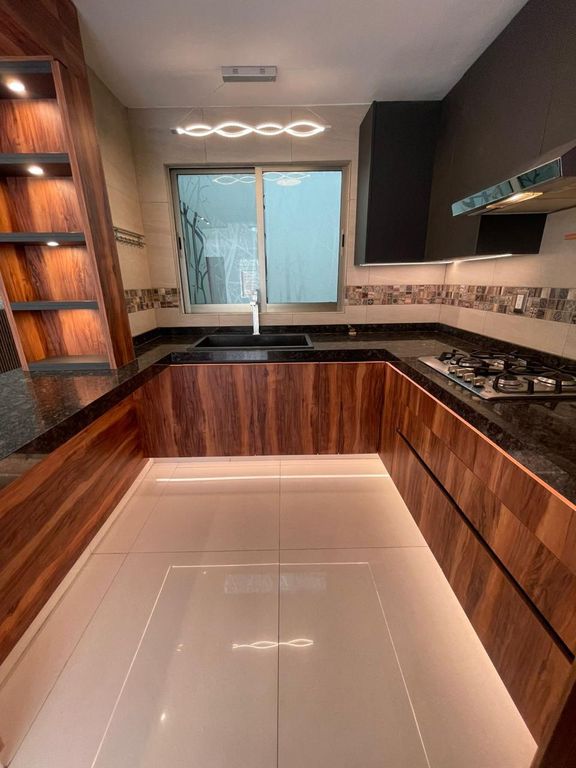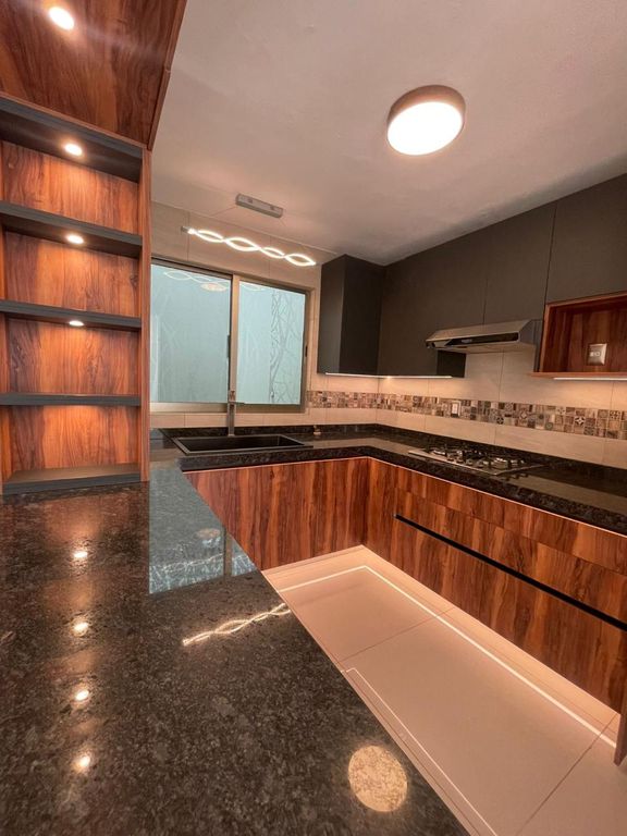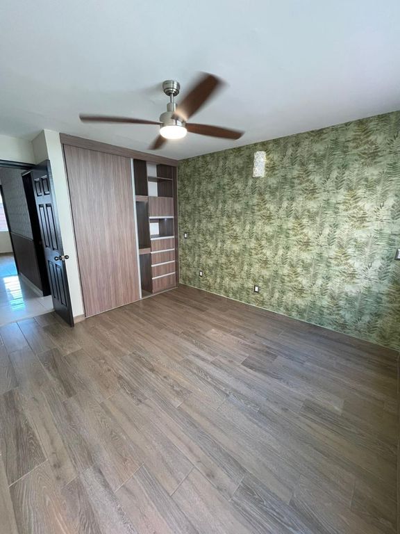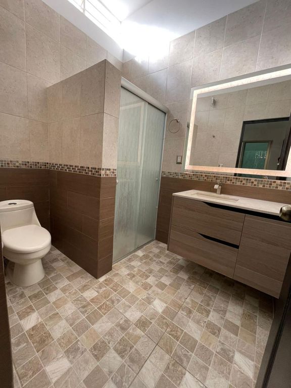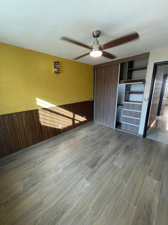 Distribución: 3 recámaras, cada una con clóset, 1 baño completo con mueble de lavamanos flotante, cubierta de granito y espejo touch, Cocina integral con barra de granito y alacena de madera, 2 espacios de estacionamiento