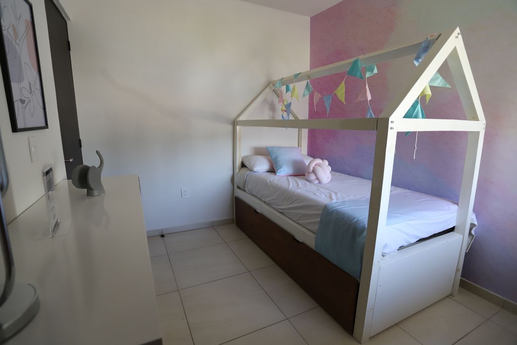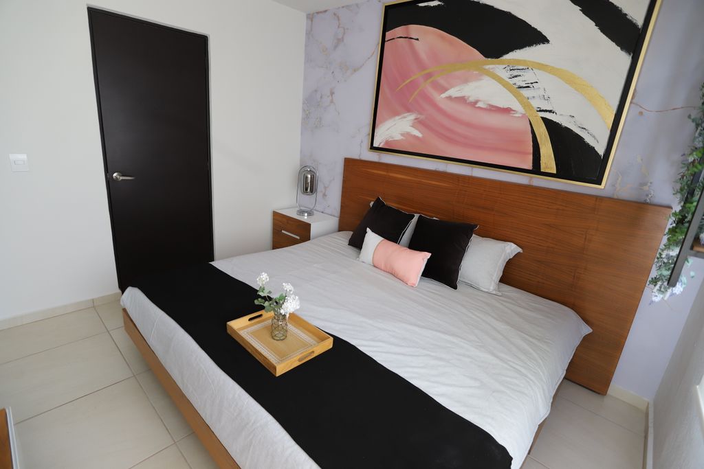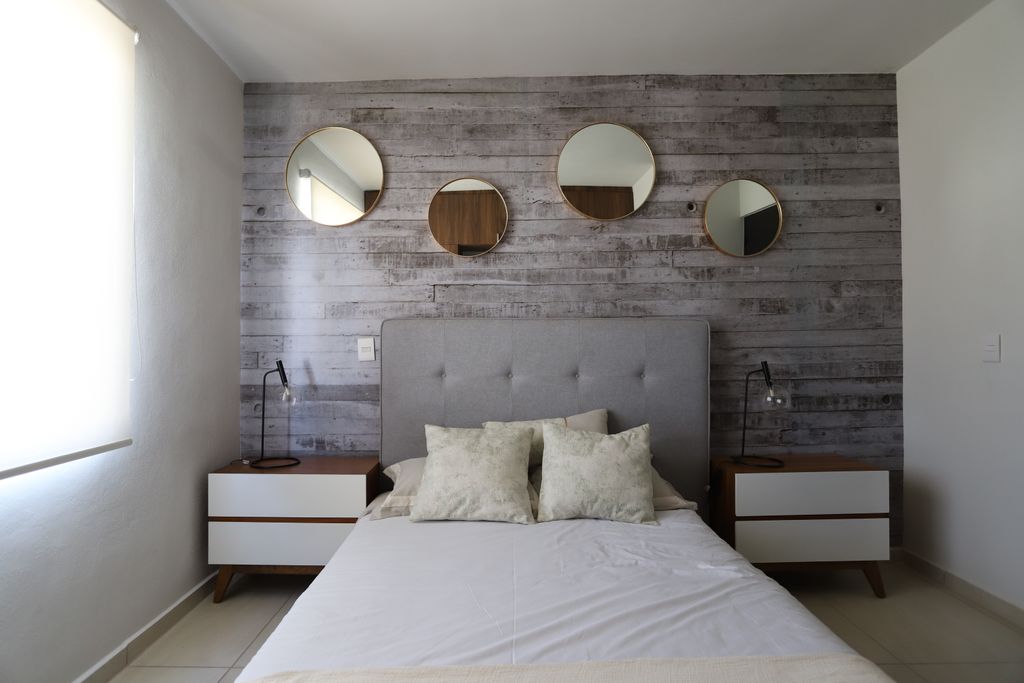 * Recámaras: Diseñadas para tu descanso, con detalles como muros con textura de madera y espejos decorativos.