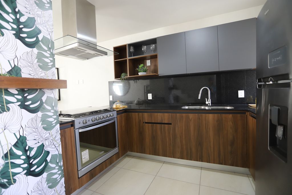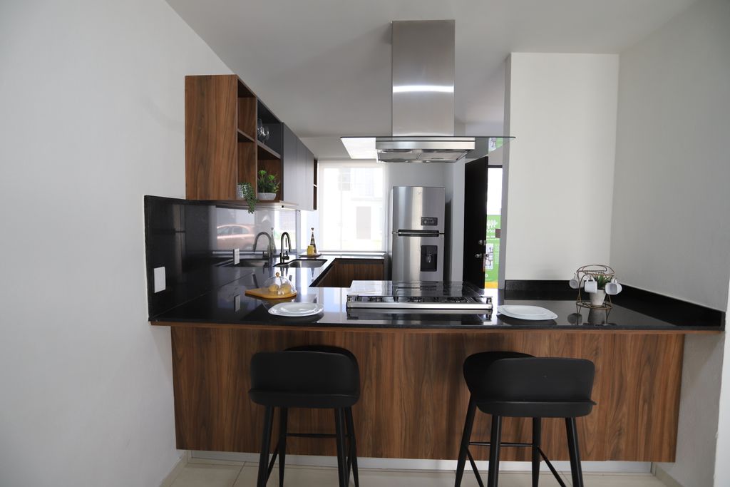 * Cocina integral: Equipada con cubierta de granito negro y gabinetes de madera, además de campana extractora de acero inoxidable.