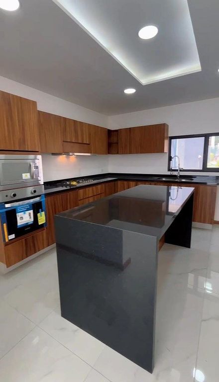 Amplia área de sala, comedor y cocina en concepto abierto equipada que incluye hornos, barra de granito y alacena. Cuenta con cuarto de lavado, medio baño para visitas y recámara en planta baja con aire acondicionado, vestidor y baño completo, ideal para huéspedes u oficina.