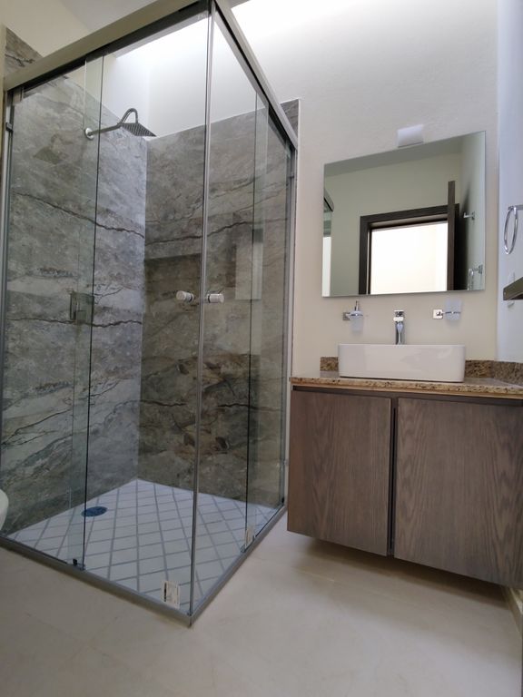 Ventanas y ventanales en aluminio de 2 y 3 pulgadas en color negro con vidrio de 6mm, canceles de baño y pasamanos de escalera en cristal templado. Luminarias led empotrables, muebles de baño one piece marca Urrea, piso porcelánico rectificado 60 X 60.
