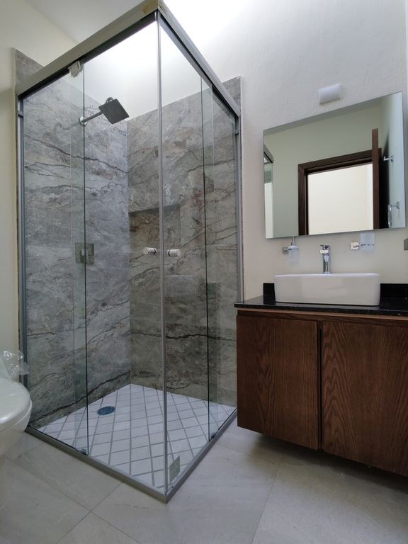 Ventanas y ventanales en aluminio de 2 y 3 pulgadas en color negro con vidrio de 6mm, canceles de baño y pasamanos de escalera en cristal templado. Luminarias led empotrables, muebles de baño one piece marca Urrea, piso porcelánico rectificado 60 X 60.