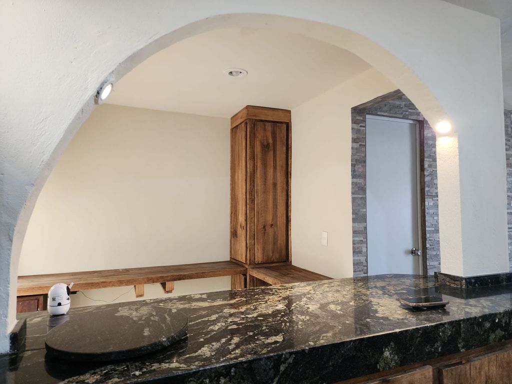 Planta Baja. Cochera para 2 autos, área sala y comedor, cocina integral con barra desayunadora, estudio o tercer recamara, baño completo y patio.