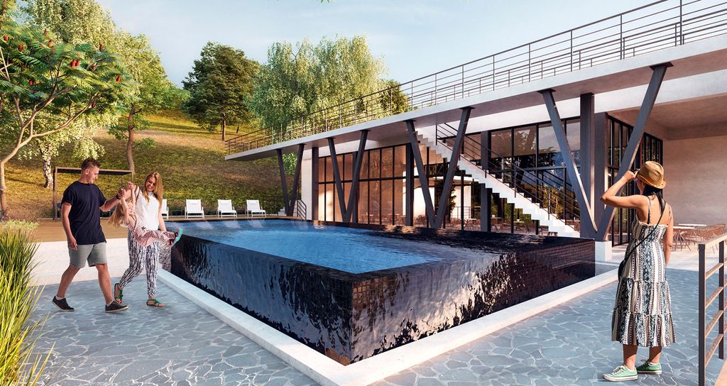 ?Gimnasio al aire libre y parque central con juegos infantiles, fuentes ornamentales y una hermosa escalinata escultórica.