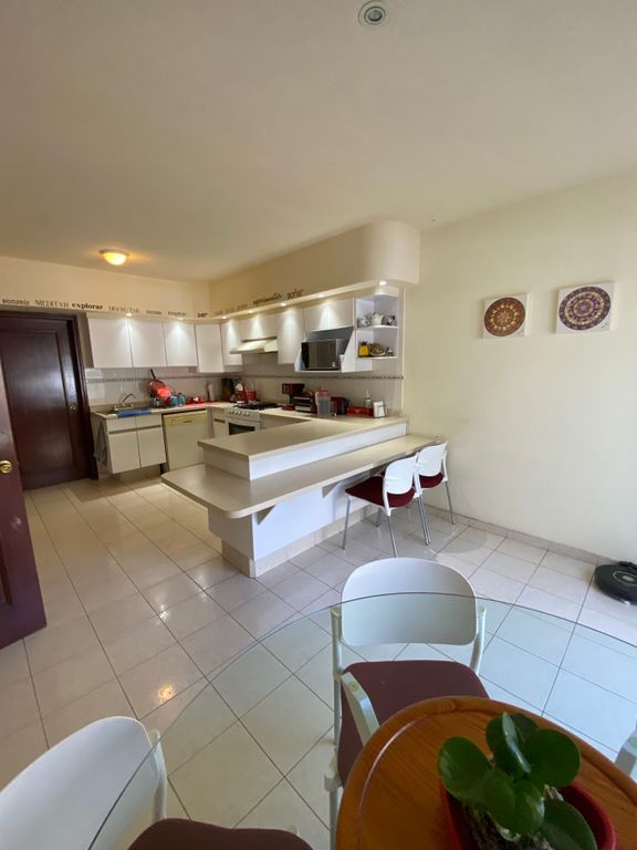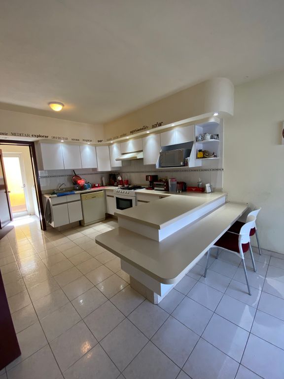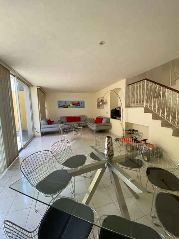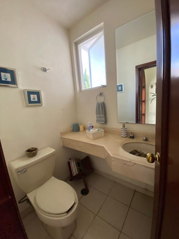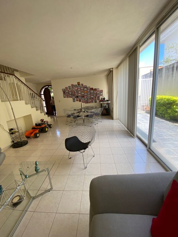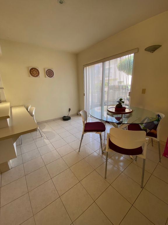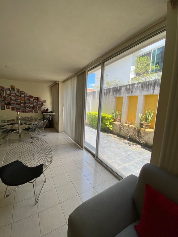 Cochera para 2 autos, medio baño, amplio espacio de sala comedor que se abre a un patio con jardineras, cocina equipada y desayunador. Área de lavado, cuarto de servicio con baño completo y patio de servicio.