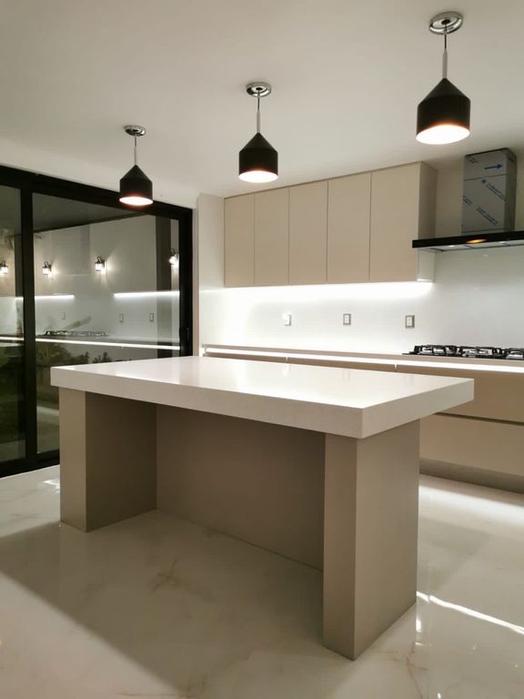 Cocina integral con cubiertas de cuarzo, equipada con hornos, lavavaillas, refrigerador y barra desayunadora tambien con cuarzo.