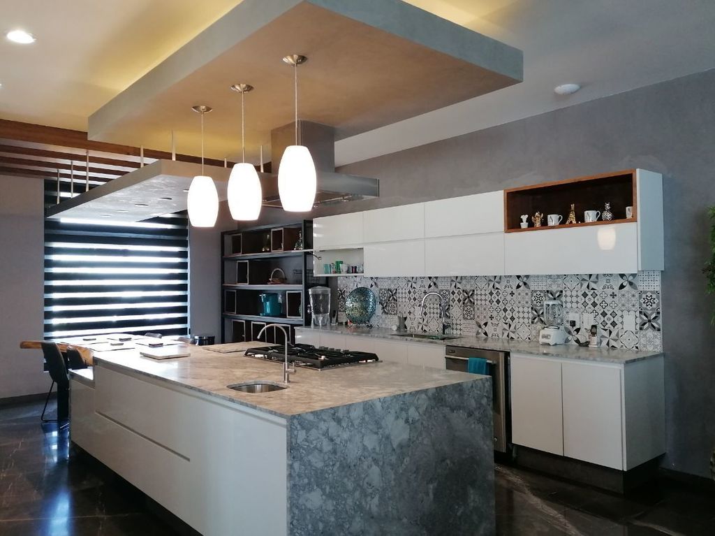Cocina equipada con acabados españoles, granito importado e isla con iluminación independiente