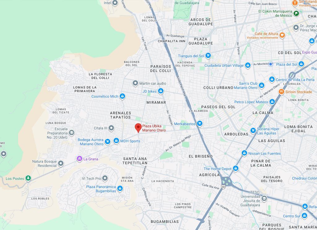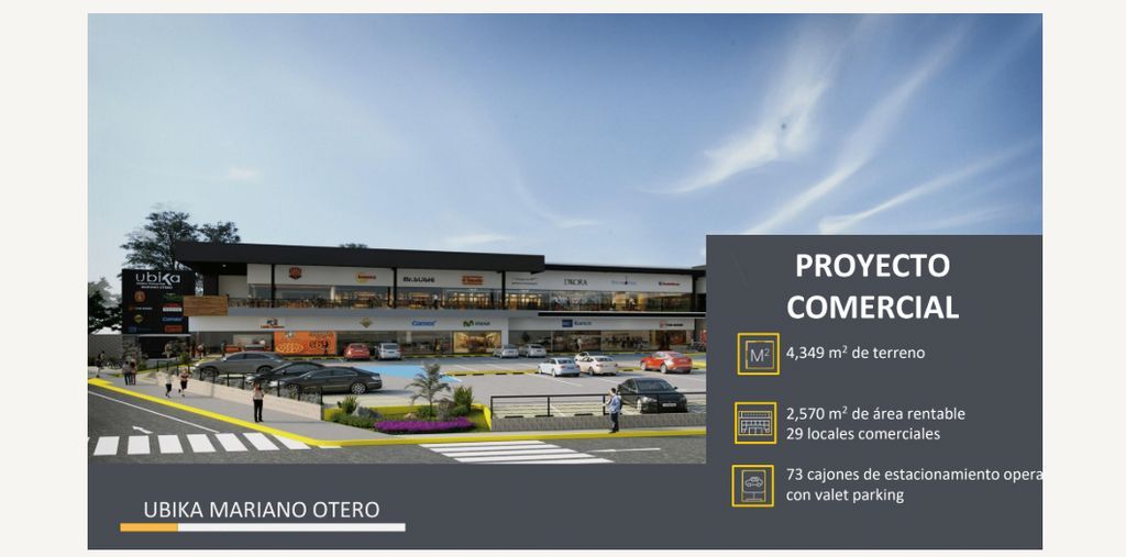 Locales en renta en Plaza Ubika Mariano Otero, con ubicación privilegiada, en la plaza mas moderna y con las mejores marcas en esta zona de la ciudad, con alto tráfico vehícular, a 5 minutos de Anillo Periférico Sur, en zona residencial consolidada de segmento socio economico medio y medio alto. Más de 62 mil habitantes en un radio de 2 kms.
