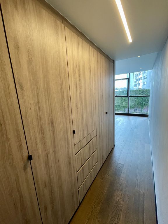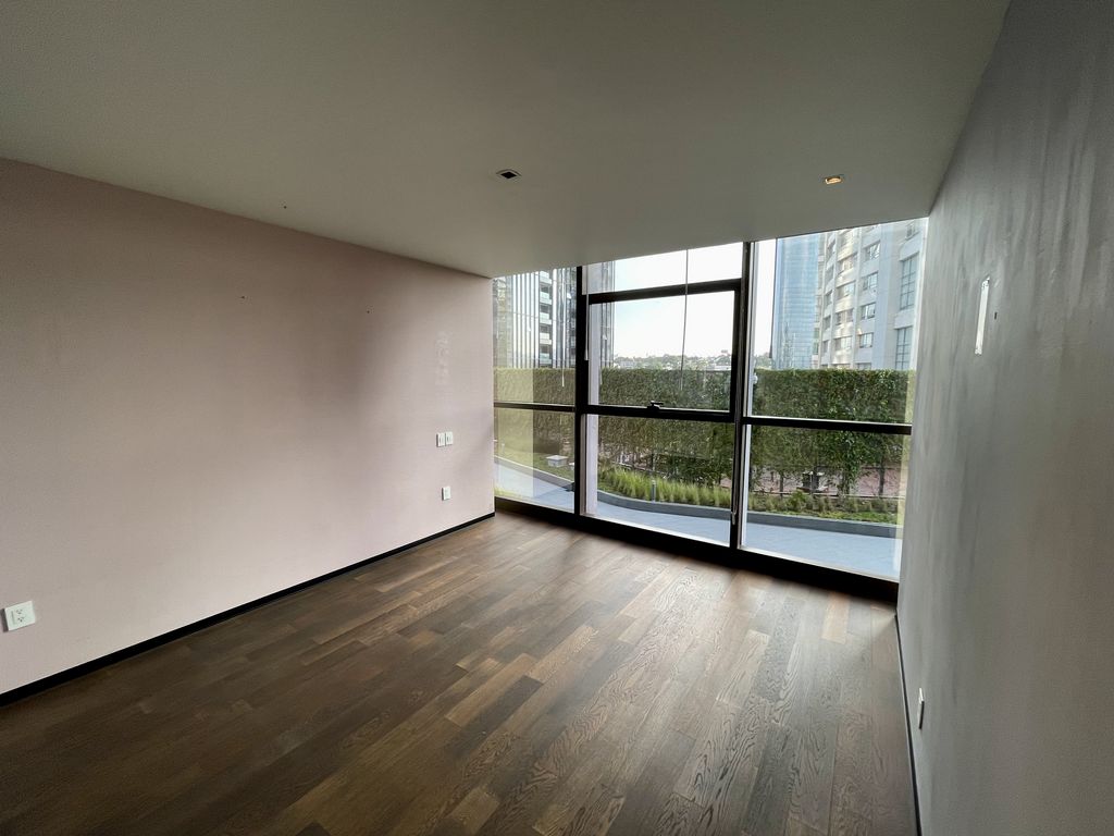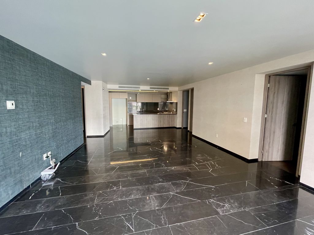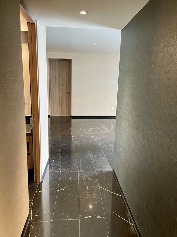 Cuenta con cortinas black out, aire acondicionado, acabados en mármol oscuro, duela oscura y papel tapiz en muros.