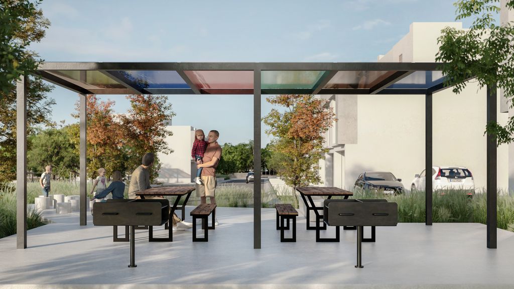 Amplias áreas verdes, pergolados y dog park