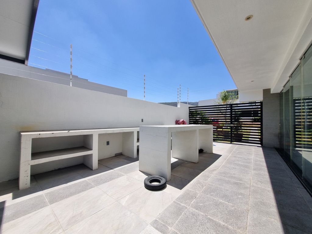 Planta Baja: Estacionamiento para 4 autos, espaciosa área de sala y comedor, cocina abierta con isla, recamara con baño completo, patio posterior y terraza lateral equipada con asador y barra.