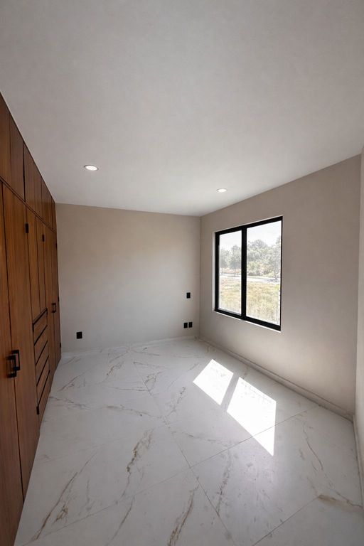 Cuanta con 3 niveles, 4 habitaciones incluyendo la de servicio, la principal con vestidor. 2 baños completos, 2 medios baños, instalación hidráulica y eléctrica para aires acondicionados, preparación de agua y gas para cuarto de lavado en planta baja y planta alta, Roofgarden, cocina con alacena, pasillo de servicio, jardín frontal y chochera para 2 autos.