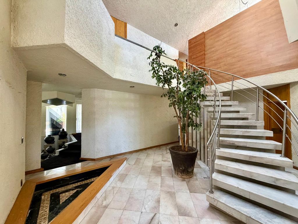 •? ?Elegante ingreso con recibidor a doble altura y fuente decorativa, medio baño para visitas y acceso independiente desde cochera.