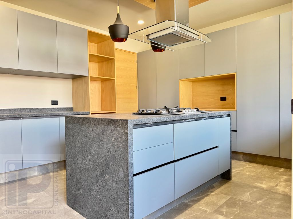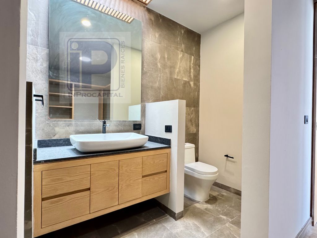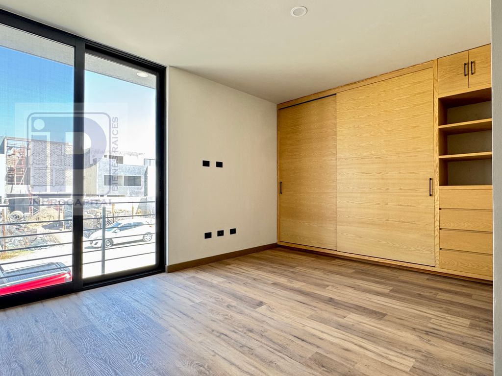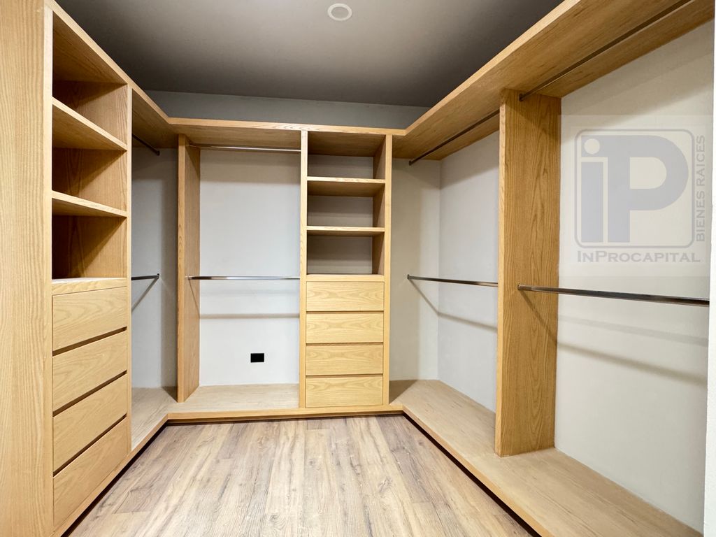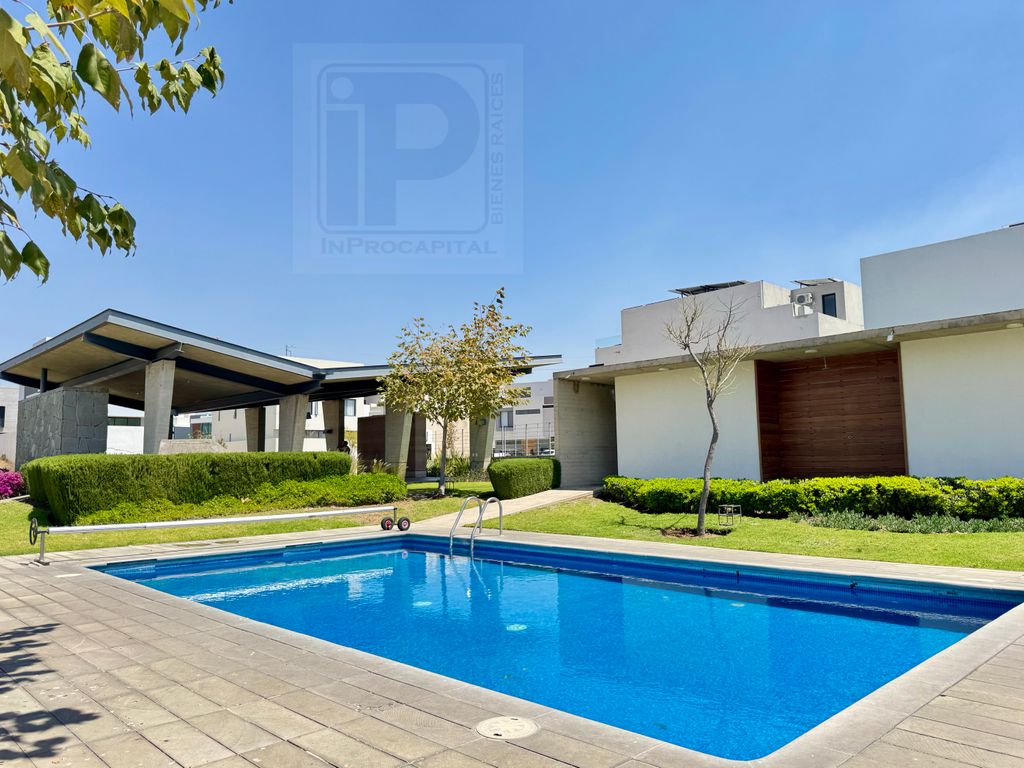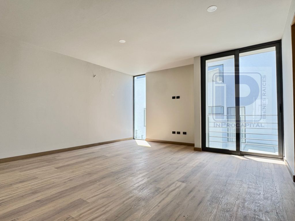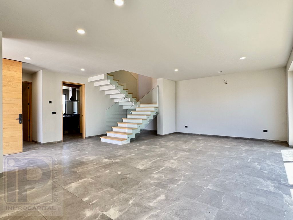 En planta baja ofrece una amplia área social con sala, comedor, cocina integral con isla y acceso a jardín. En planta alta se encuentran las recámaras, destacando la principal con vestidor de gran tamaño y excelente iluminación natural.
