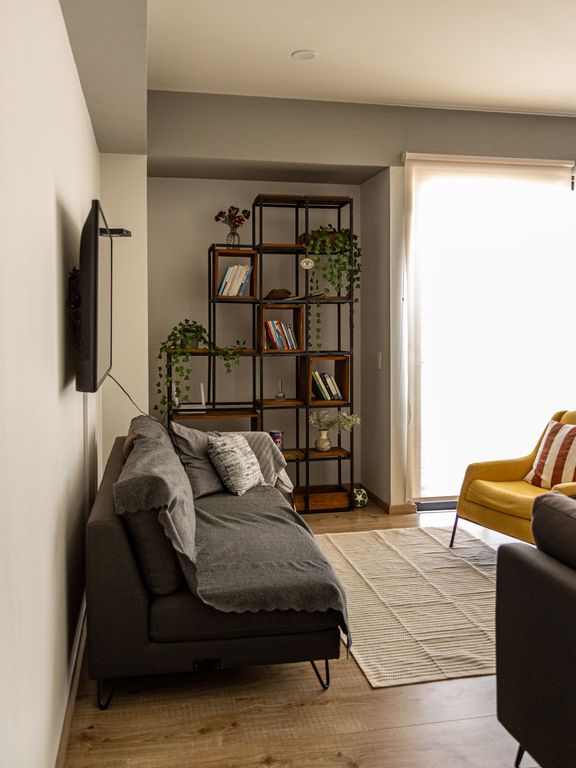 -Área social abierta con estantería de madera integrada.