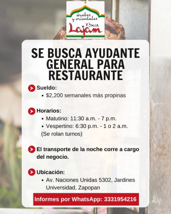 AYUDANTE general para Restaurante Presentarse Av. Naciones Unidas 5302. Después de las 2:00 de la tarde. WhatsApp 33 3195-4216