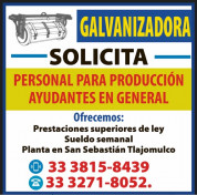 AYUDANTE GENERAL PARA PRENSAS PLANAS /PRODUCCIÓN Con y sin experiencia Zona de trabajo: Cercano Parque Agua Azul. -Pagos semanales -Vales de despensa -Fondo de ahorro -Horario de lunes a viernes y sábados (medio día) Descanso los domingos Informes por WhatsApp 33 3559-5902