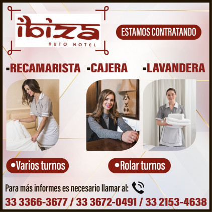 RECAMARISTA -Varios turnos *CAJERA *LAVANDERA Rolar turnos Para más informes es necesario llamar al: 33 3366-3677 33 3672-0491 33 2153-4638