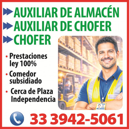 AUXILIAR DE ALMACÉN AUXILIAR DE CHOFER CHOFER *Prestaciones de ley 100% *Comedor subsidiado. *Bono de asistencia/ puntualidad 10%. *Estabilidad laboral *Cerca de Plaza Independencia 33 3942-5061.