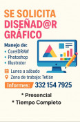 DISEÑADOR experiencia CorelDraw; buen sueldo, prestaciones ley, semana lunes -viernes. Presentar solicitud elaborada Aldama 319 Centro Puente Grande Jalisco.